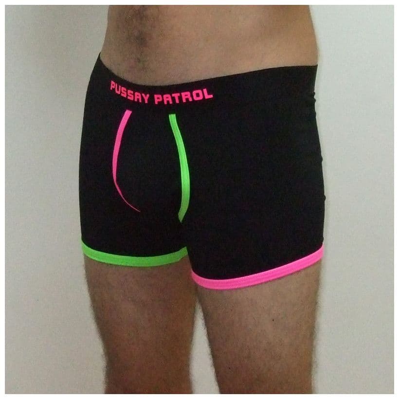 High quality black boxer shorts edged in hot pink and vivid green trim with the words PUSSAY PATROL on the waistband.  These attractive boxer shorts are sure to be a hit with inbetweeners fans who are looking for something other than a t shirt.